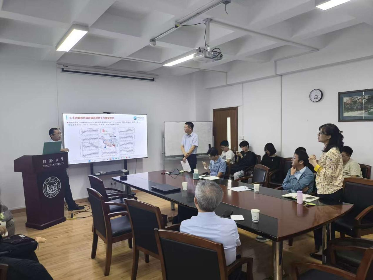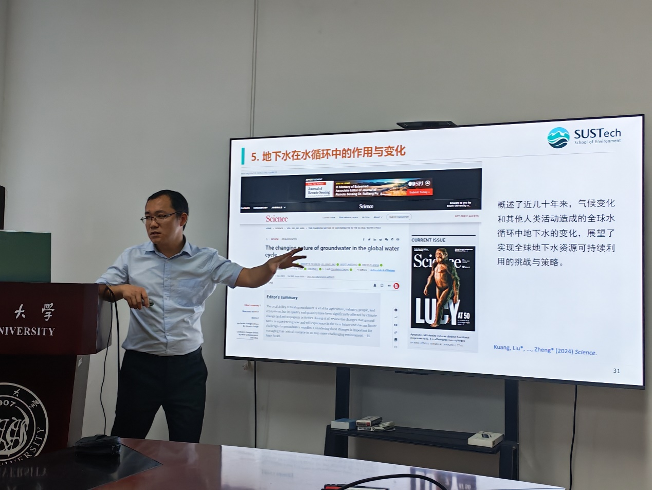 在学术报告中,焦赳赳教授以“自晚更新世以来珠江三角洲及邻近陆架地区地下水系统的演化”为题,系统阐述了该区域地下水系统在地质历史时期的演变规律。匡星星研究员则围绕“气候变化对青藏高原地下水的影响”,深入剖析了现代气候响应对高原地下水系统的影响机制。两场报告分别从“古地质演化”与“现代气候响应”两大维度展开,既有时间跨度上的纵深,又有学科交叉的广度,充分展现了水文地质研究的前沿动向与多元视角,为在场师生提供了关于“流域水文过程”与“海陆相互作用”等领域的新思路。